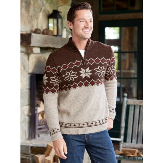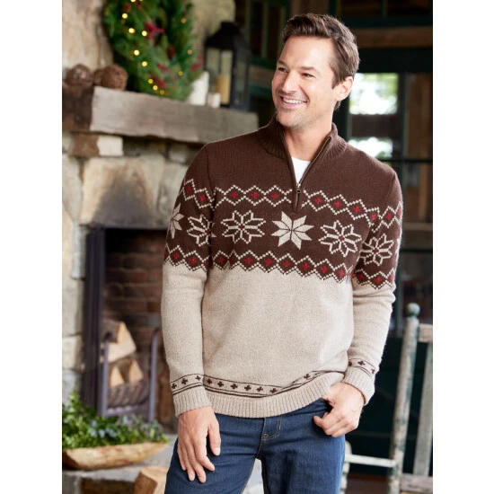This festive pullover sweater is at home on the slopes, in the lodge, or wherever you enjoy winter. It’s knit from soft acrylic and wool, making it warm, breathable, and durable. It features an all-around diamond and snowflake design and is finished with a half-zip and a rib-knit stand-up collar, cuffs, and hem.