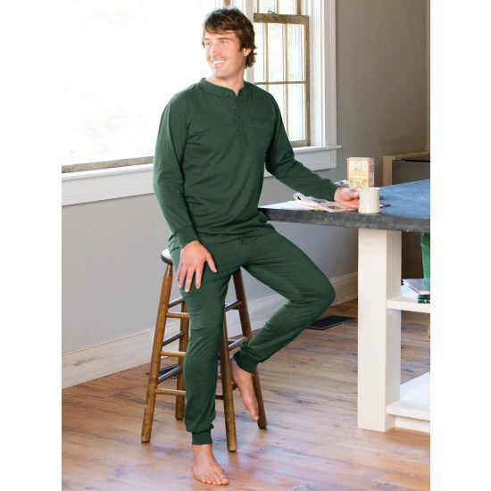 Our lounge-worthy cotton-knit ski pajamas are now in an even softer and longer-wearing jersey knit. Unlike synthetic fabrics, cotton is naturally absorbent, so you won’t wake up in a sweat. The top has a 4-button Henley neck, rib-knit cuffs, and a rib-knit trimmed chest pocket; the elastic-waist bottoms have a full button fly, rib-knit cuffs, and side-seam pockets.