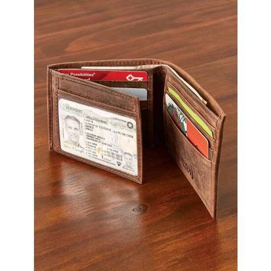 This premium-crafted tri-fold wallet blends the best of yesteryear with today. It’s made of durable cowhide leather with a rich oil finish and top-stitching detail to give it a true vintage look and feel. For your protection, the wallet is also outfitted with an RFID-blocking lining to keep your credit and debit cards safe. Other features include two slots for bills (one with a spare key pouch), eight card slots, and dual fold-out identification windows.