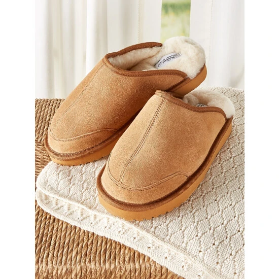 These classic scuffs have an easy slip-on style and an indoor/outdoor outsole, so you can wear them outside. They feature soft genuine cow suede uppers and are lined with real Australian shearling, which ensures they will keep your feet warm and comfortable. They are also crafted for a comfy fit and made to last for many seasons.