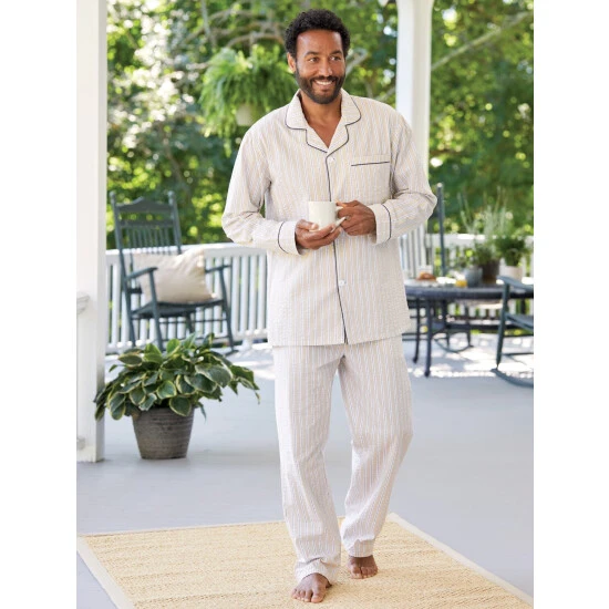 What do we sleep in on hot, sultry summer nights? 100% cotton seersucker, of course. We love it for its puckery texture, which stands away from the body so air can circulate, keeping us cooler all through the night. Navy piping on the button front, cuffs, and chest pocket adorneach striped pajama top; pajama bottoms have an elastic waist with an adjustable drawstring for added comfort.